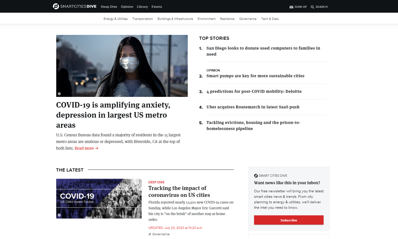 미국 전역 도시의 교통, 건축 및 인프라, 거버넌스, 환경, 기술, 데이터 등 스마트도시와 관련된 다양한 동향 정보를 제공하는 웹사이트