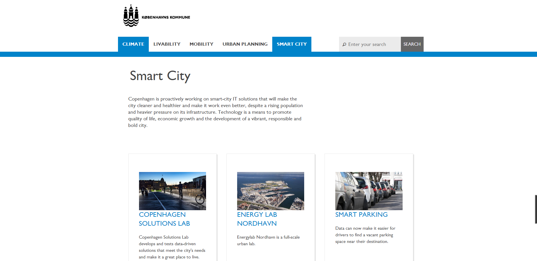 코펜하겐 스마트시티 정책과 프로젝트를 소개하는 웹사이트