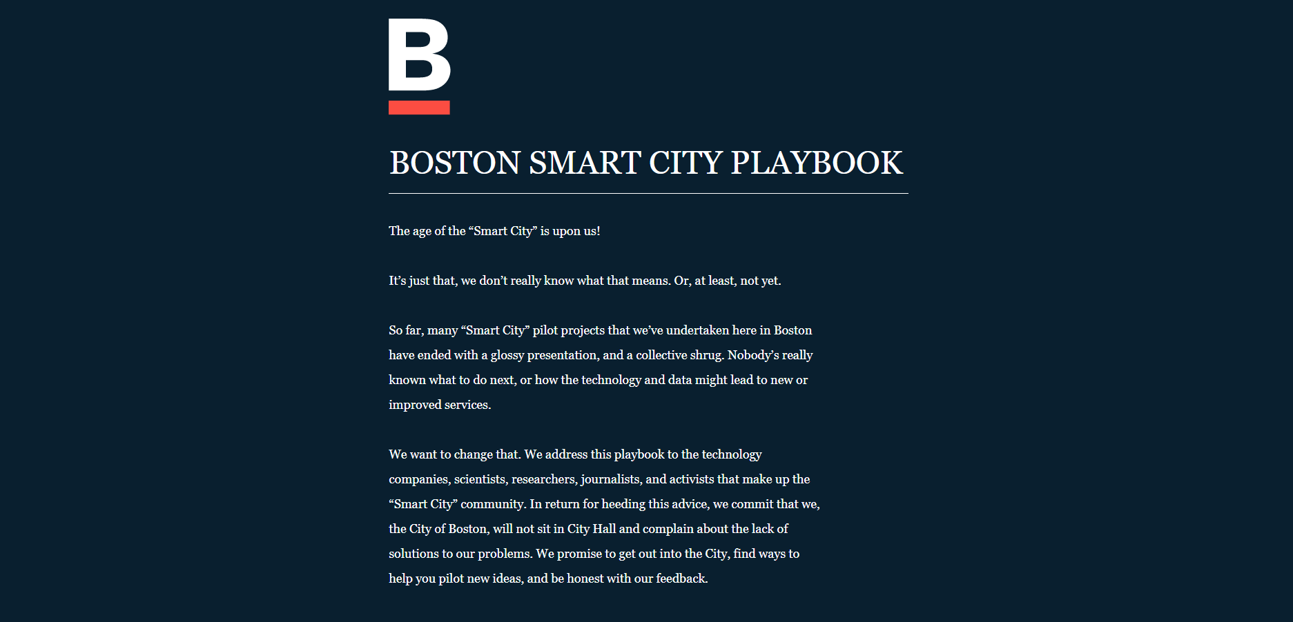 스마트시티가 지녀야할 핵심 요소와 각 요소별로 보스턴은 어떤 준비를 하고 있는지에 대한 정보를 제공하는 플레이북 형식의 웹사이트