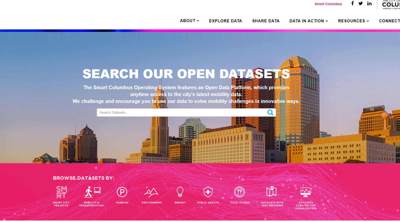 콜럼버스시가 제공하는 분야별 데이터셋과 해당 데이터를 사용하여 도출한 결과물(APP 등) 정보를 확인할 수 있는 웹사이트